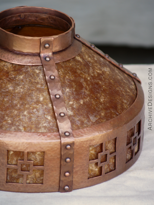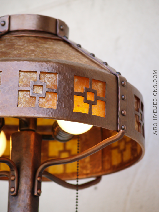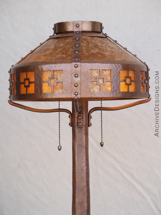 This unique hammered copper lamp—a free-standing torchiere—was designed for long-time clients for their California bungalow. The cutouts in the shade, with glowing amber mica behind, are abstractions of flowers in the Arts & Crafts style, and the top cone is also of translucent amber mica. This piece was one among several pieces made for the same client, including a fireplace screen, chandelier, and range hood.